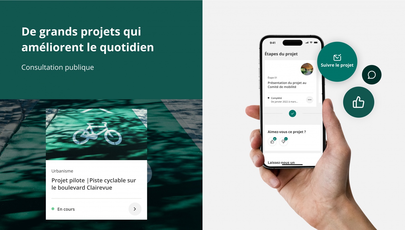 Consultation citoyenne - L’Espace citoyen propose une multitude d’options allant des sondages publiques aux consultations privées et des échéanciers de projets aux commentaires et appréciations. La ville est ainsi en mesure de recueillir l’intégralité de l’opinion citoyenne dans une seule et même plateforme.